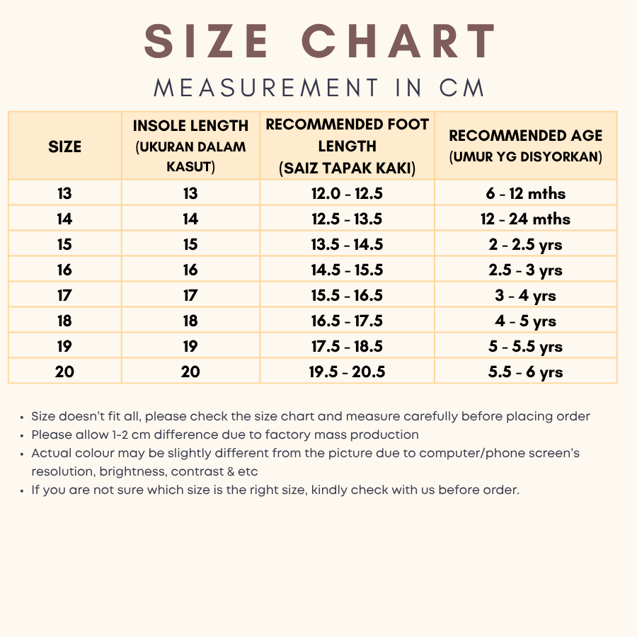 Comel gila kasut ni. Muat utk anak umur 11 bulan, panjang tapak kaki 13cm. Ada space sikit je, sbb mmg nak beli besar sikit. Tapi nampak anak pakai selesa. Design dan warna cute sama mcm dlm gambar. 😁👍🏾
