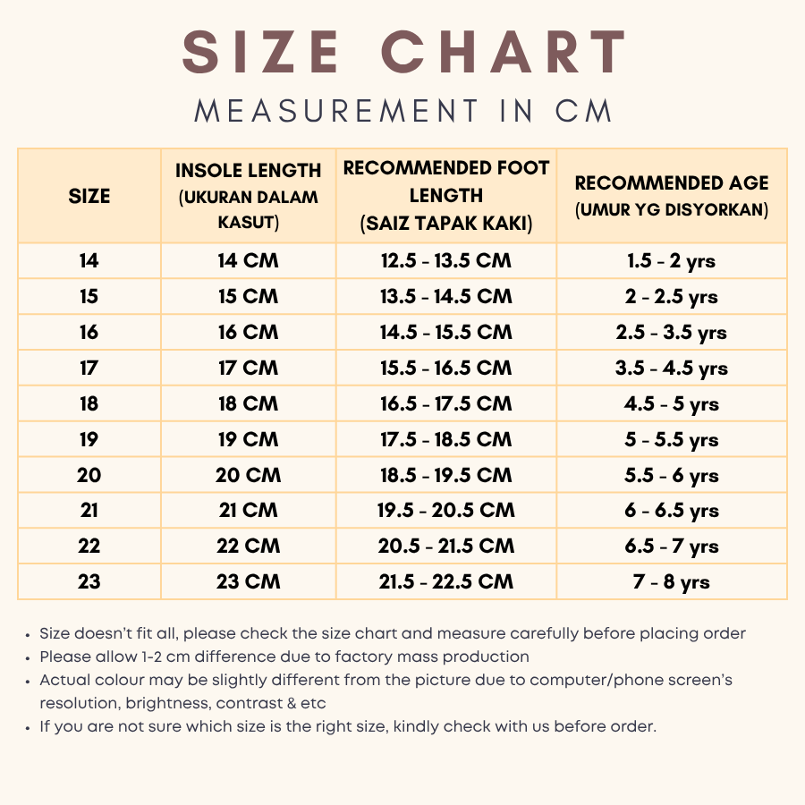 Beli utk anak umur 2 tahun lebih. Size ni mcm besar sikit tp ok je still boleh pakai lg & boleh pakai lama. Kalau rasa loose boleh pakaikan socks hehe. Tapak sedap, zap on dia pun boleh tahan kuat. Worth the price la org kata
