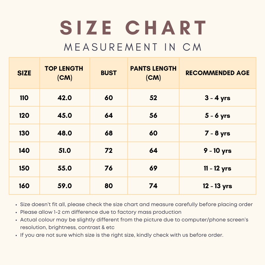 Ank 7thn baju saiz kecik, seluar saiz OK cuma material agk nipis n jarang. kolar agk kecik ssh nk msk kepala. Mungkin kepala ank besar. Jd ssh sikit. Blh utk bt baju kt rmh. Klu repeat color lain kena ambik saiz 150.