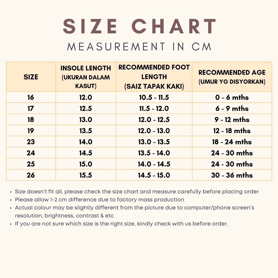 Kasut cantik & selesa utk kaki baby. Ukuran sesuai ikut chart yg disediakan