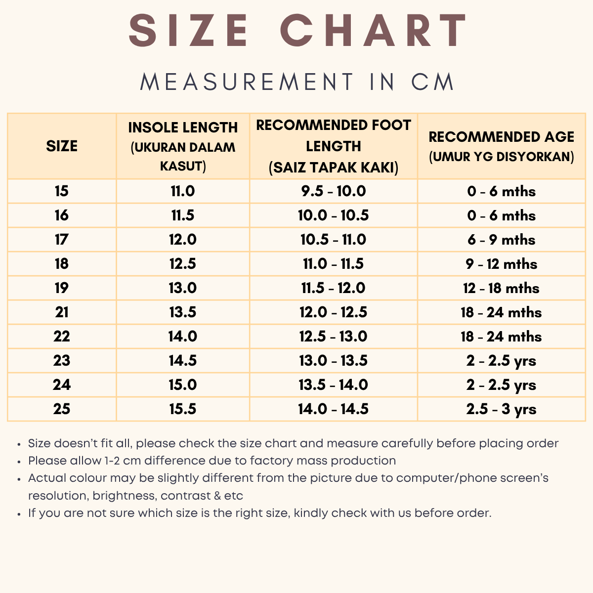 Kasut cantik tp besar sangat untuk anak saya umur setahun 1 bulan.. ingat nk buat raya.. tp sayang xmuat.. xpe blh simpan untuk pkai nnti.. penghantaran super laju.. murah blh repeat lagi nanti