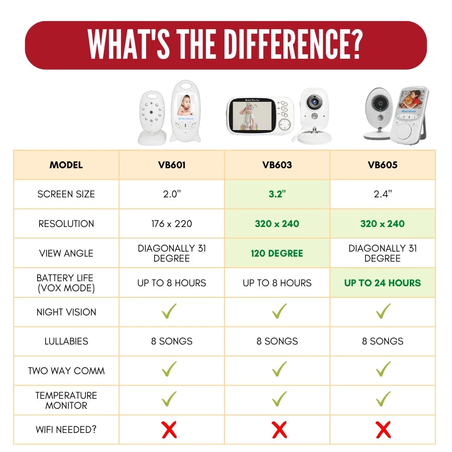 Choose from 3 models: VB601, VB603, or VB605 — all with night vision and portable screen.