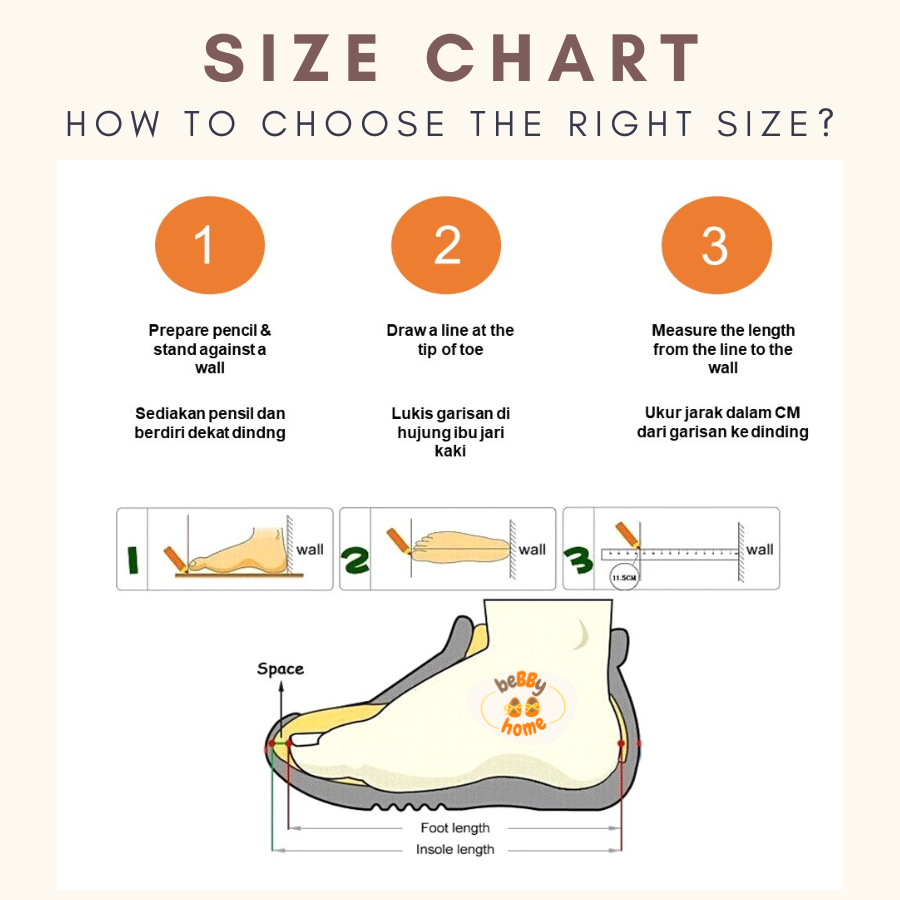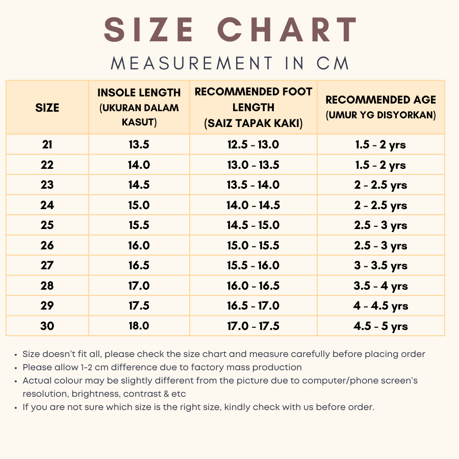 Ukuran tapak kaki ank i 14.5cm sy ambil 1/2 lebih dari saiz tapak kaki so i ambil saiz 24. tak pakai stoking akan ada byk ruang. bila pakai stoking pun ada sikit ruang. kalau nk ngam ketatkan tali. so far elok terletak je bila anak pakai. love!!! ❤️ cantik mcm design NB. i prefer if nak beli amek saiz 1 or 1/2 bigger than ukuran betul tapak kaki anak. sebab kaki bdk cepat membesar takut beli yg ngam ngam tak dan pakai lama dah tak muat. Thank you seller, seller sangat sangat peramah so i give 5 starrrr!! ❤️