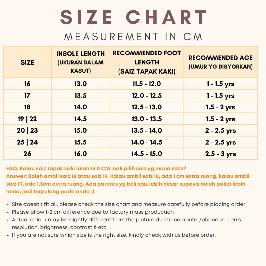 Sandal baby ini sesuai untuk umur 1 hingga 3 tahun. Tapak lembut dan ringan — sesuai untuk pakai harian di rumah, jalan-jalan atau ke taska.
