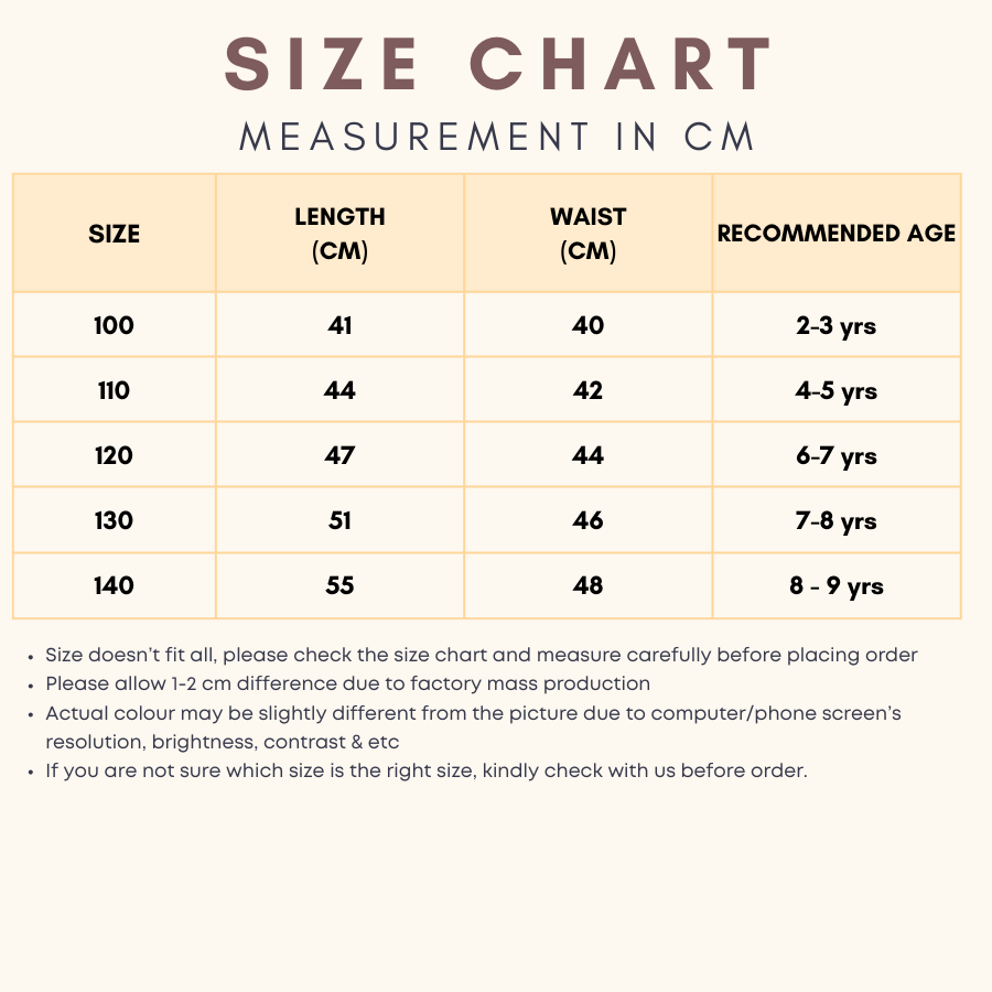 Seluar legging ini sesuai untuk kanak-kanak perempuan umur 2 hingga 9 tahun. Material kapas yang lembut & boleh regang — sesuai dipakai ke sekolah, berjalan, atau di rumah.