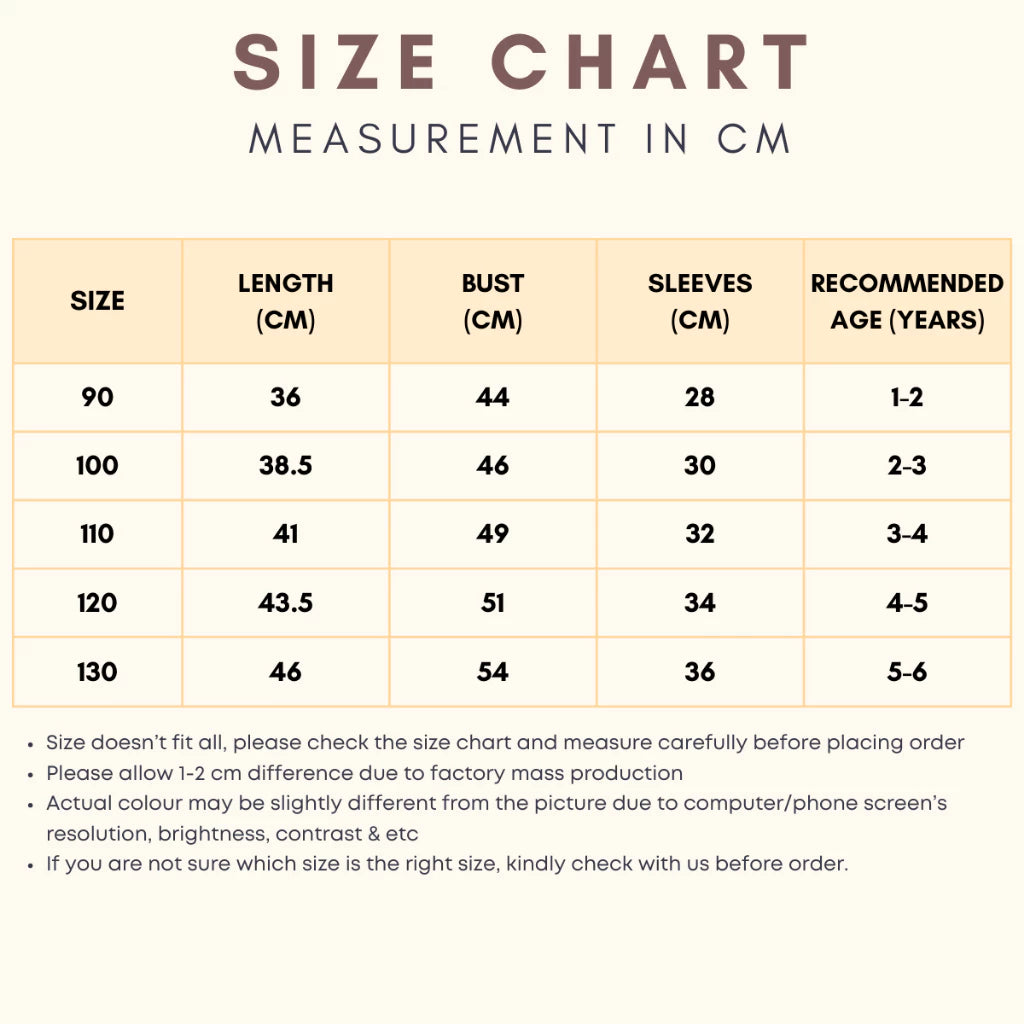 Baju blouse belang berlengan panjang ini sesuai untuk kanak-kanak perempuan umur 1 hingga 6 tahun. Material lembut & selesa dipakai — sesuai untuk jalan-jalan, ke taska atau majlis keluarga. Padankan saja dengan seluar atau skirt, terus nampak kemas & bergaya!