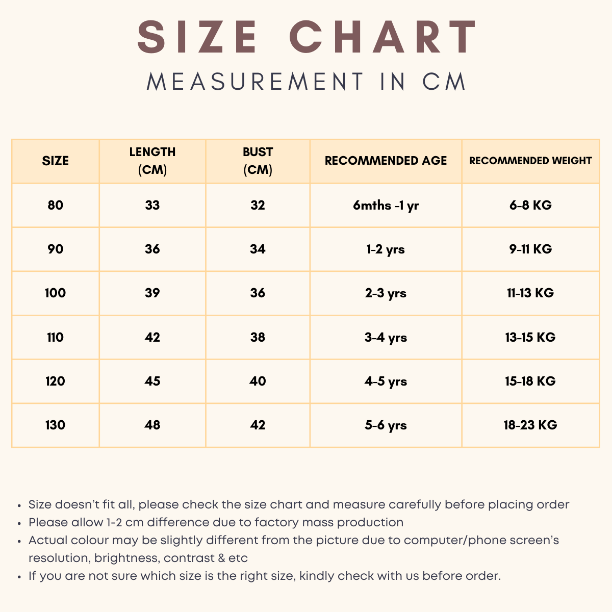 Sama macam dalam gambar. Kain sedap. Cutting besar. Saiz 80 muat untuk anak 1y berat 11kg.