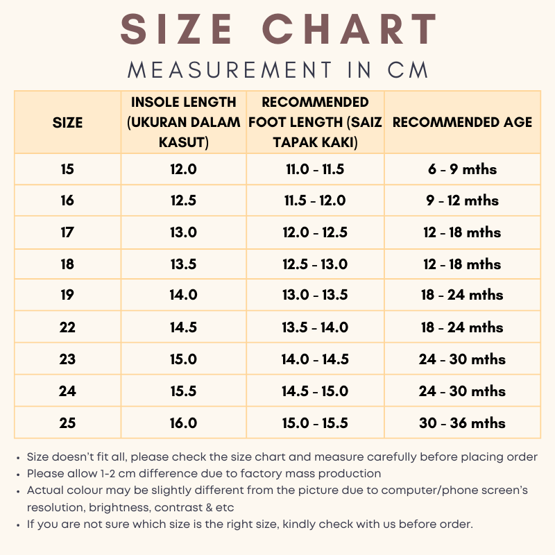 Kasut sgt cantik!!!beli utk baby 1yrs.. size muat2..tp mmg kena ukur dulu ya kaki anak b4 beli.. nanti nak repeat lagi kt kedai ni.. penghantaran pun pantas.. tq seller!