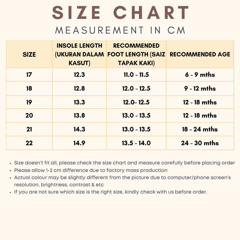 Kasut cantik elok, berbaloi dengan harga..Tapak getah antislip, kasut kain xkeras sgt xlembut sgt, sesuai untuk baby..Cuma agk besar dr yg saya ukur..ingt nk beli ngam2 biar bleh pkai terus, ni kena simpan lg tggu muat dgn kaki bru selesa pkai...Rasanya kalau baby kaki chubby mmg comei pakai kasut ni