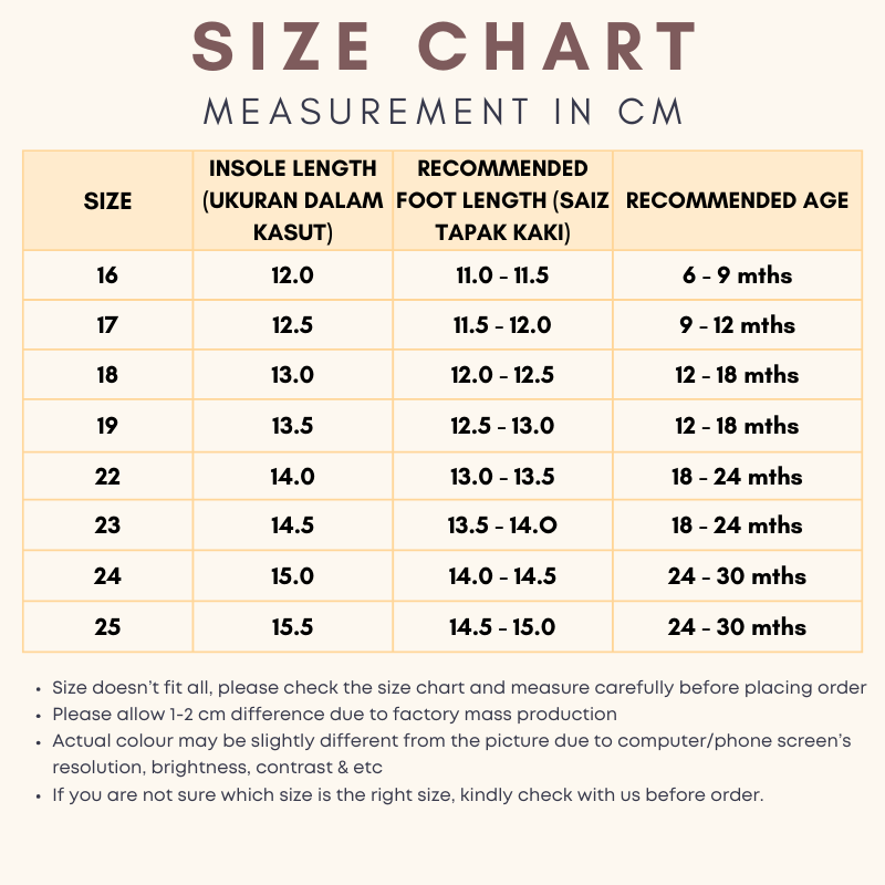 Anak saya umur 1 thn 11 bulan.ambil size ini memang ada besar sikit.tapi ok 👍 kasut lembut,dalam tapak pun lembut.delivery sangat laju.